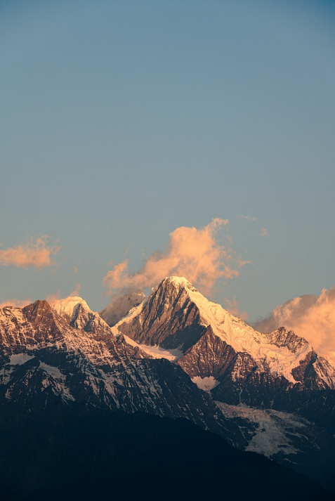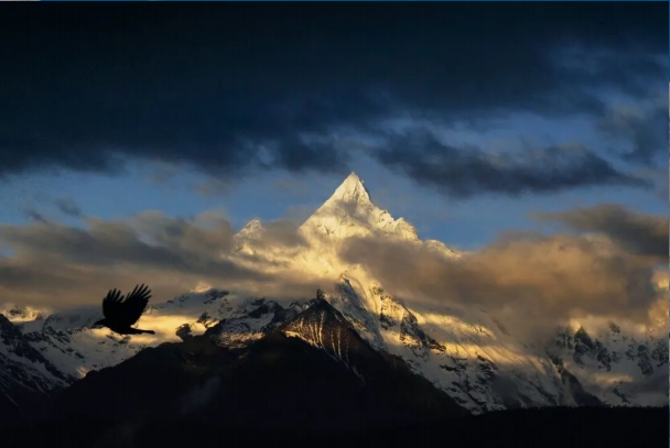 当清晨的第一缕阳光刺破云层,雾霭散去,梅里十三峰宛若揭开面纱的展露真容,而如果你有幸一睹“日照金山”胜景,更会被这近乎神迹的景观所震撼。而在这金色的光芒中回首俯视,雾浓顶村的十三白塔与炊烟则展示出属于尘世的温度。云翳聚合,光线万变,林泛层波,经幡拂动,在雪山之神的脚下,人类如同流石滩上的高山植物,虔诚而用力地生活。此刻的内心,忍不住想起: