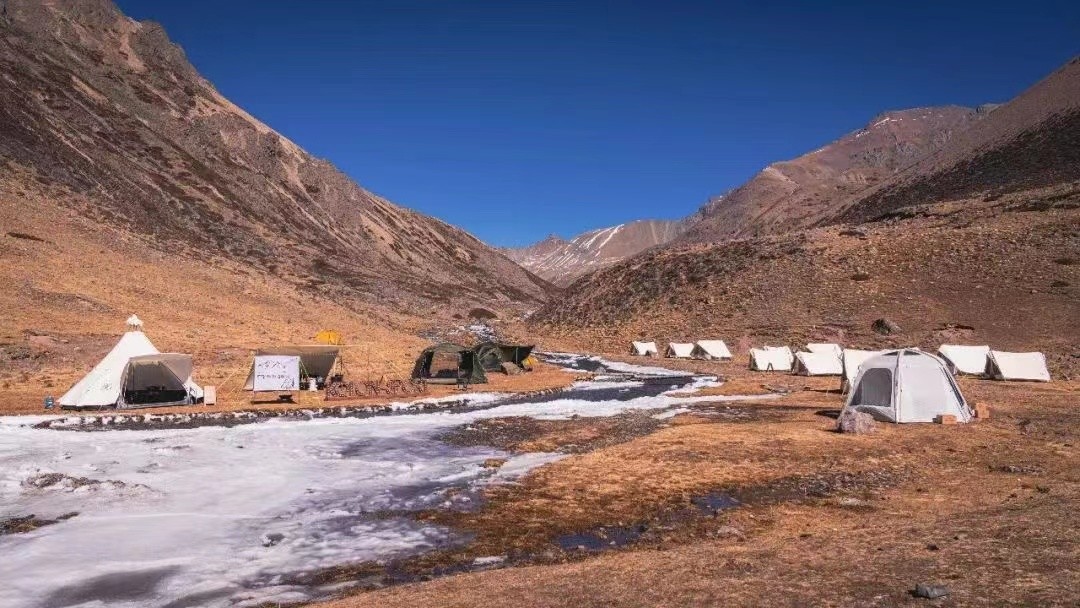 十一月末的草甸与山林已经褪去翠色,而溪水依旧潺潺。坐落在高山草甸溪边的可隆·拾野游牧营地四面群山环抱,向上可以无限的接近流石滩,对面是直插云天高耸的岩壁,周边还散落着众多的高山湖泊。