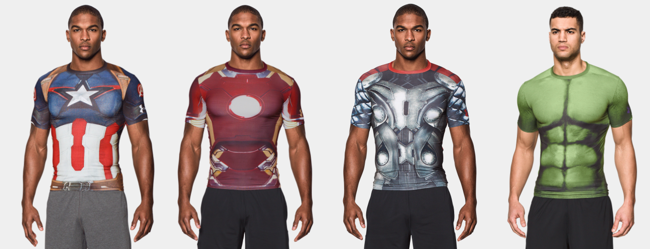 运动品牌UA在美帝非常火,以生产运动队服里面的紧身内衣为主打产品。它为复联特别出品的运动紧身衣在中国几乎是卖断了货!