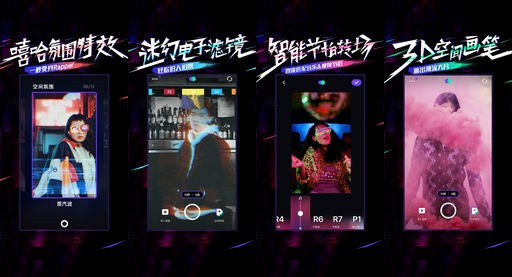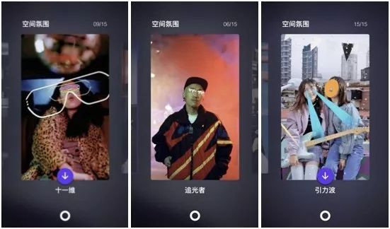 另外还有10款空间氛围功能,包括追光者、超次元、迷幻梦、十一维、蒸汽波、暗物质、无标签、大魔王、超新星、引力波。主打视频滤镜和眼部趣味元素,使用追光者氛围能通过人脸识别功能,准确定位到眼睛添加特效,放射出类似《X战警》中镭射眼的效果;十一维特效可以为你添加电子潮酷的眼镜;引力波则可以在视频里发射有趣的彩色光波。