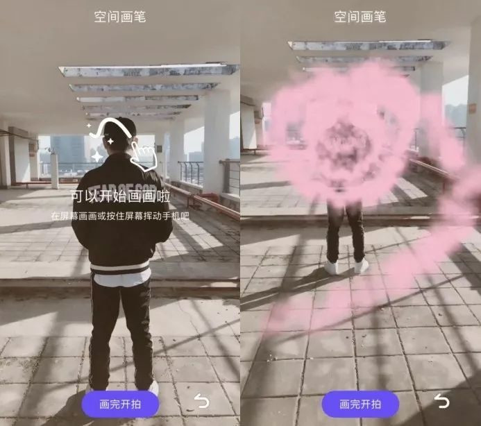 空间画笔有“烟雾棒”、“小宇宙”、“彩虹糖”和“银河系”四种,你可以在画面里任意涂鸦,再进入拍照模式,画面里就会一直有这个涂鸦了。而且当你360度拍摄的时候,可以看到这个涂鸦是立体的,字体线条在不同角度下粗细各不相同,而且当镜头拉近时涂鸦也会更靠近你,甚至会“穿透”屏幕……
