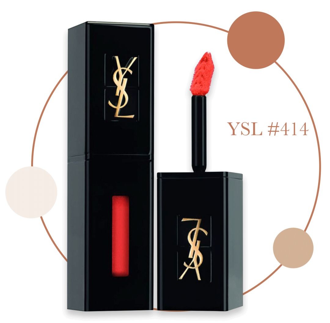 我搭配的是一支滋润质地,偏粉橘色的镜光唇釉:YSL黑管唇釉#414,这个橘完全不显黑,上脸看起来活力满满。