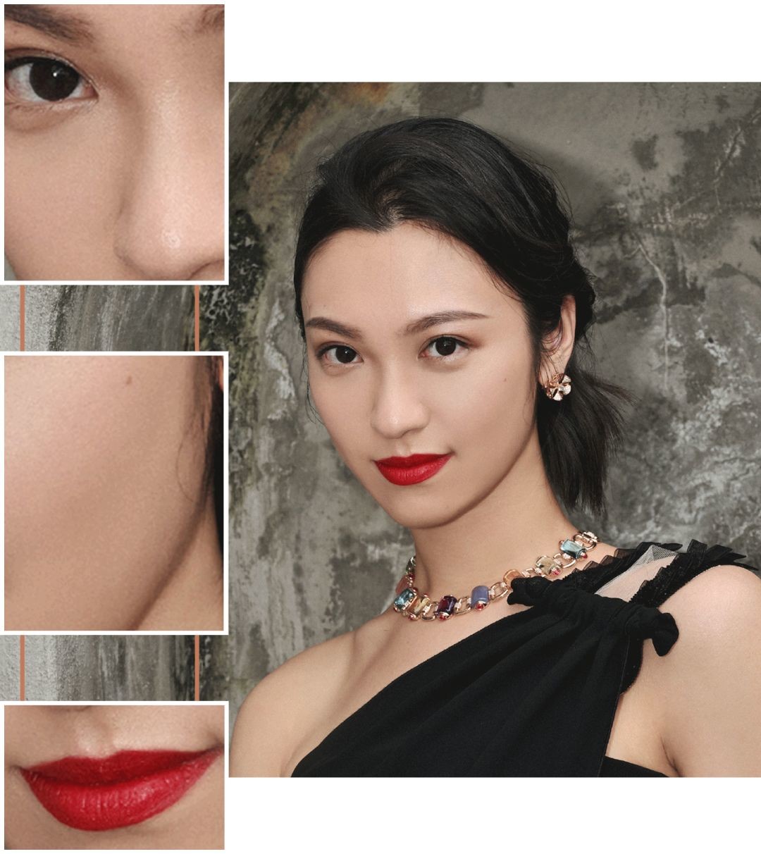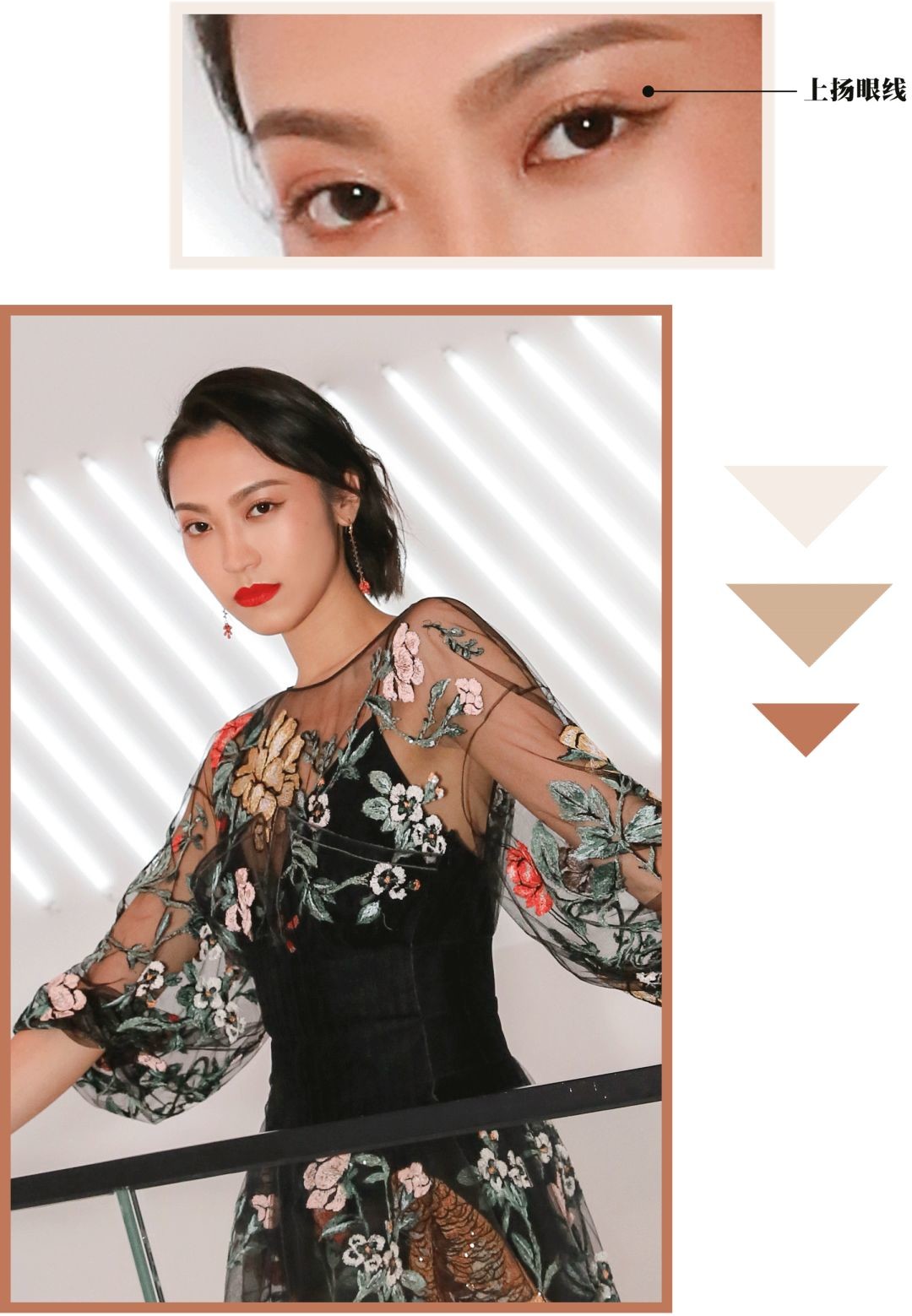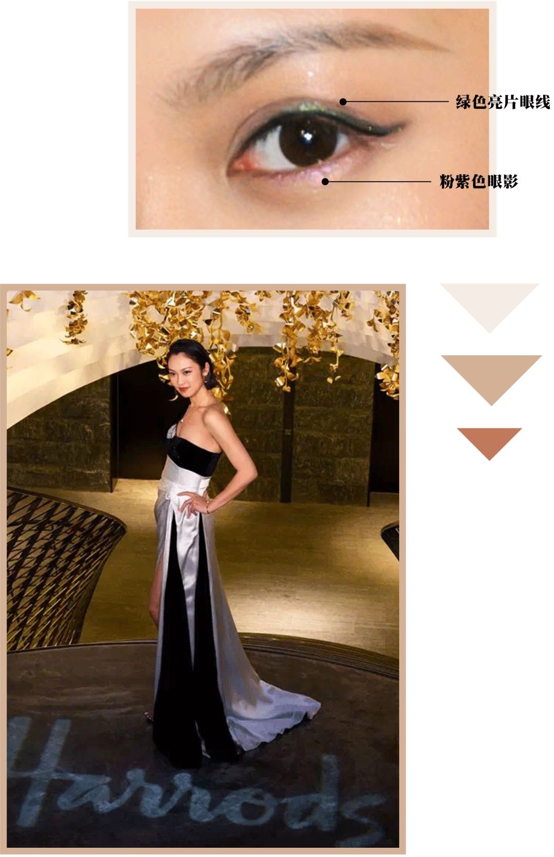 驾驭丝绒材质的礼服也不在话下,深色腮红做修容,纵向打在颧骨上,视觉上可以压颧骨修饰面部轮廓的流畅感。