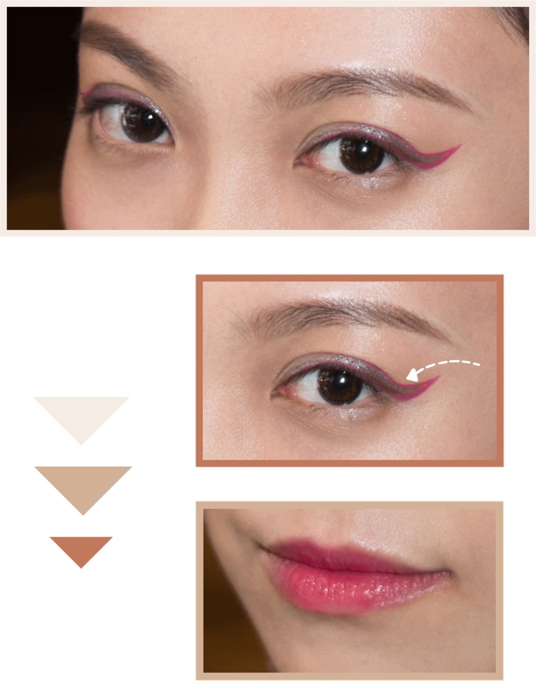 用小面积的紫色眼影画出眼线,再用玫紫色眼线液笔勾勒一条「小尾巴」,搭配同色系的口红。