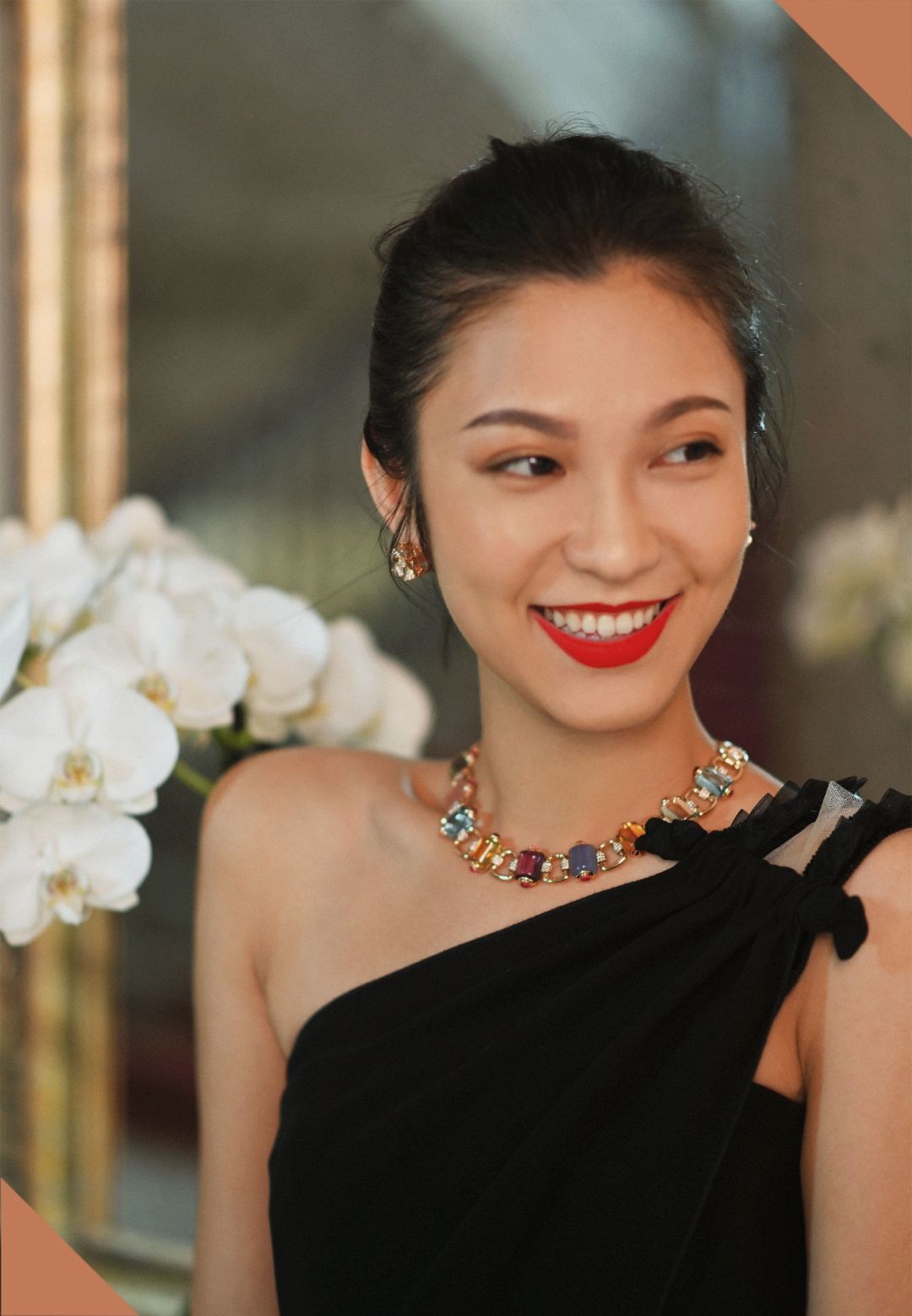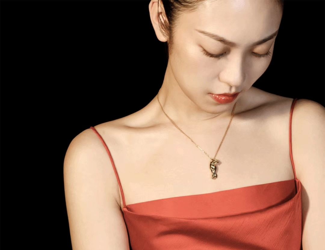 这个妆容里,口红的质地带了金属偏光,眼影也是金棕色细闪,都是为了衬金色的珠宝。