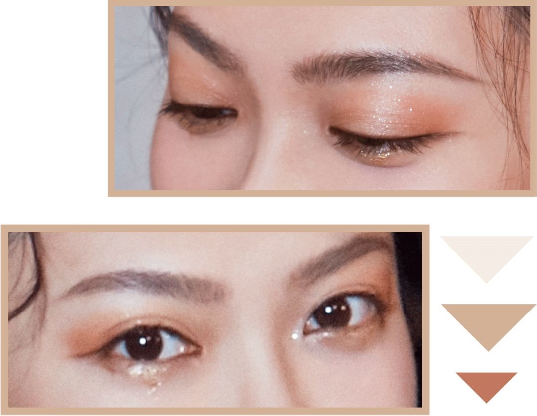 纱裙上钉花同色系的粉橘色哑光质地眼影大面积铺色,先画上内眼线,再用深棕色眼影,用细节刷平平地向外拉出一条外眼线,这样画能显得眼睛有楚楚可怜感,下眼睑用粉棕色眼影打底,