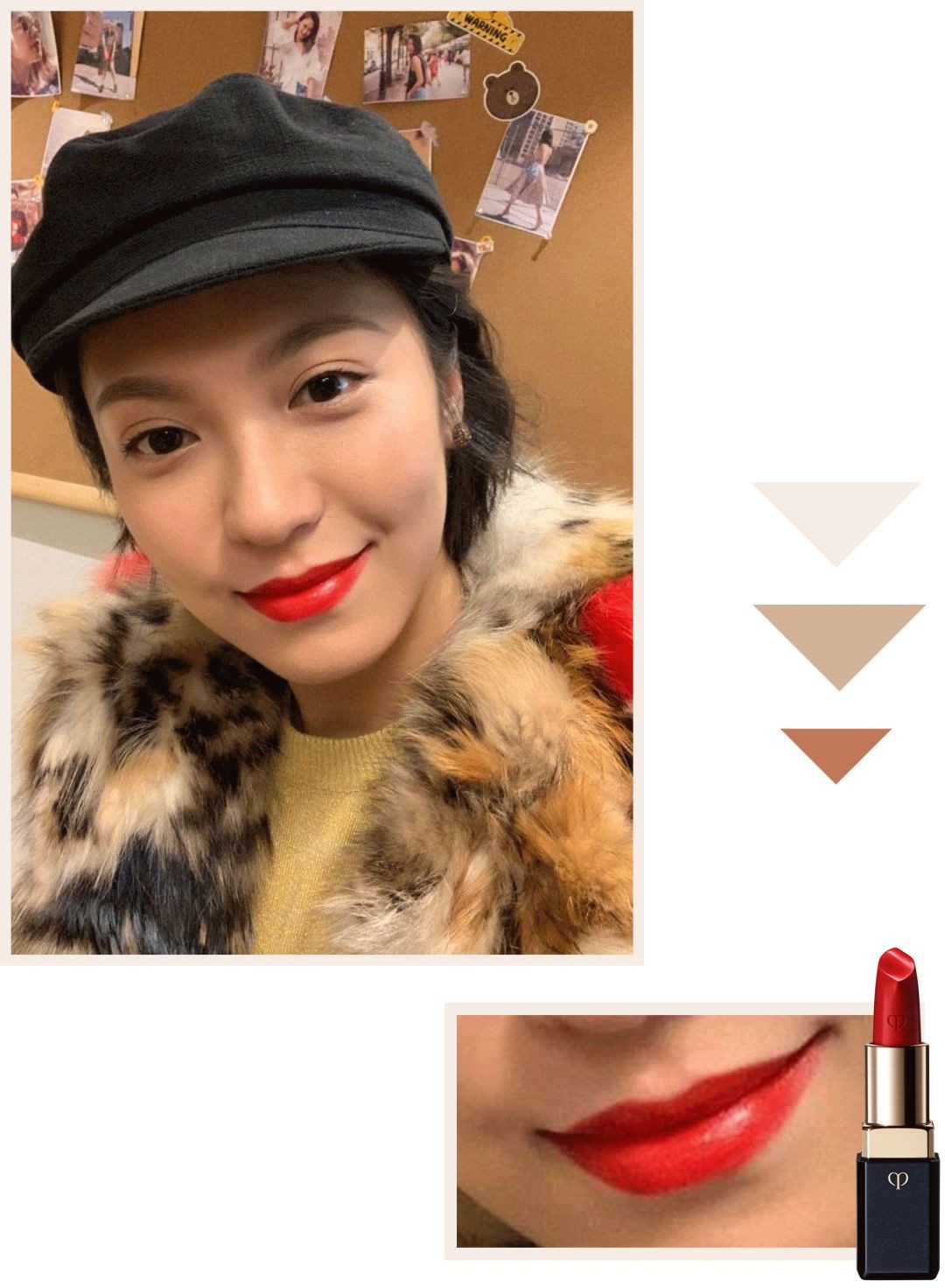 偶尔有尝试大红唇妆,不过细节处理会根据造型稍做变化:唇线勾勒分明,看起来更明艳。