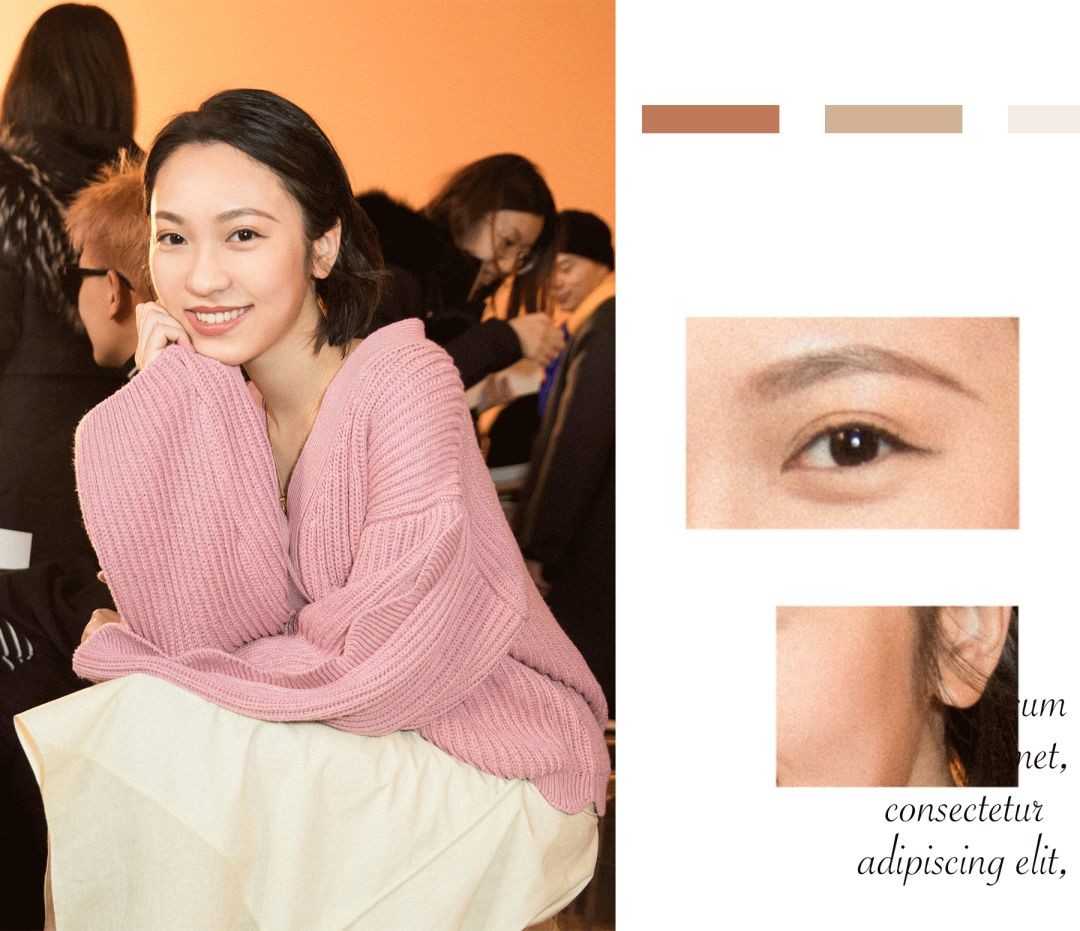 我还会直接将深色腮红当修容用,眉毛也不能太犀利,画成了延长下垂的样子,再穿上粉色的毛衣超减龄。