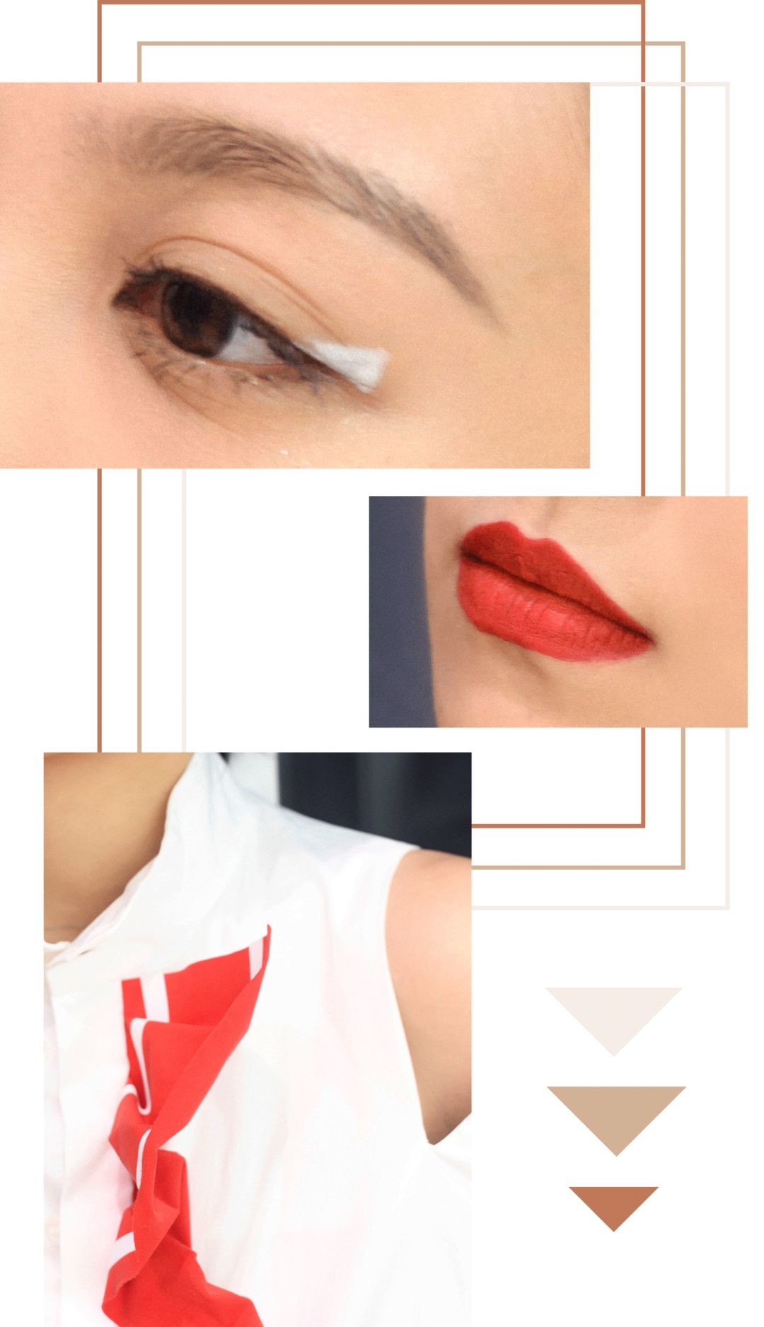 比如这一组,正红调唇色,眼尾睫毛夹翘,用白色眼线点缀,呼应我的白色衬衫。